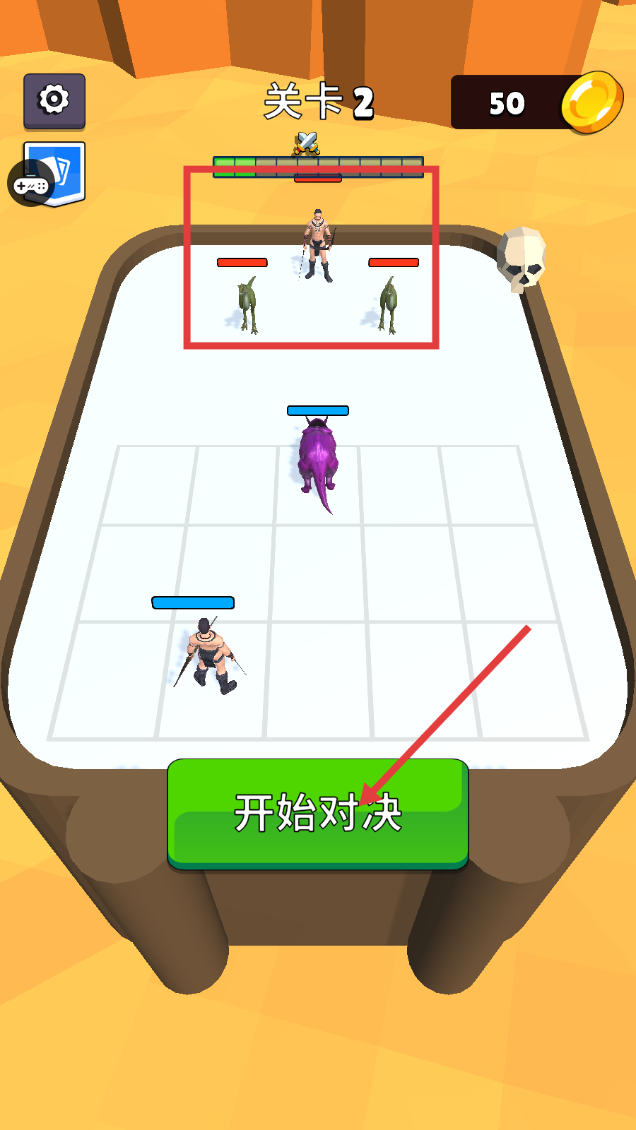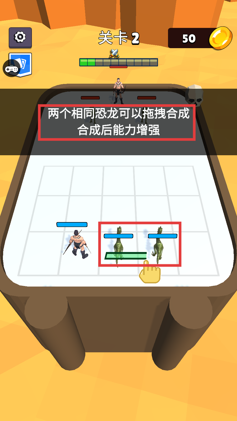 2、进入【关卡2】后,将两个相同恐龙拖拽合成,合成后的单位能力更强,可提升队伍整体作战水平。