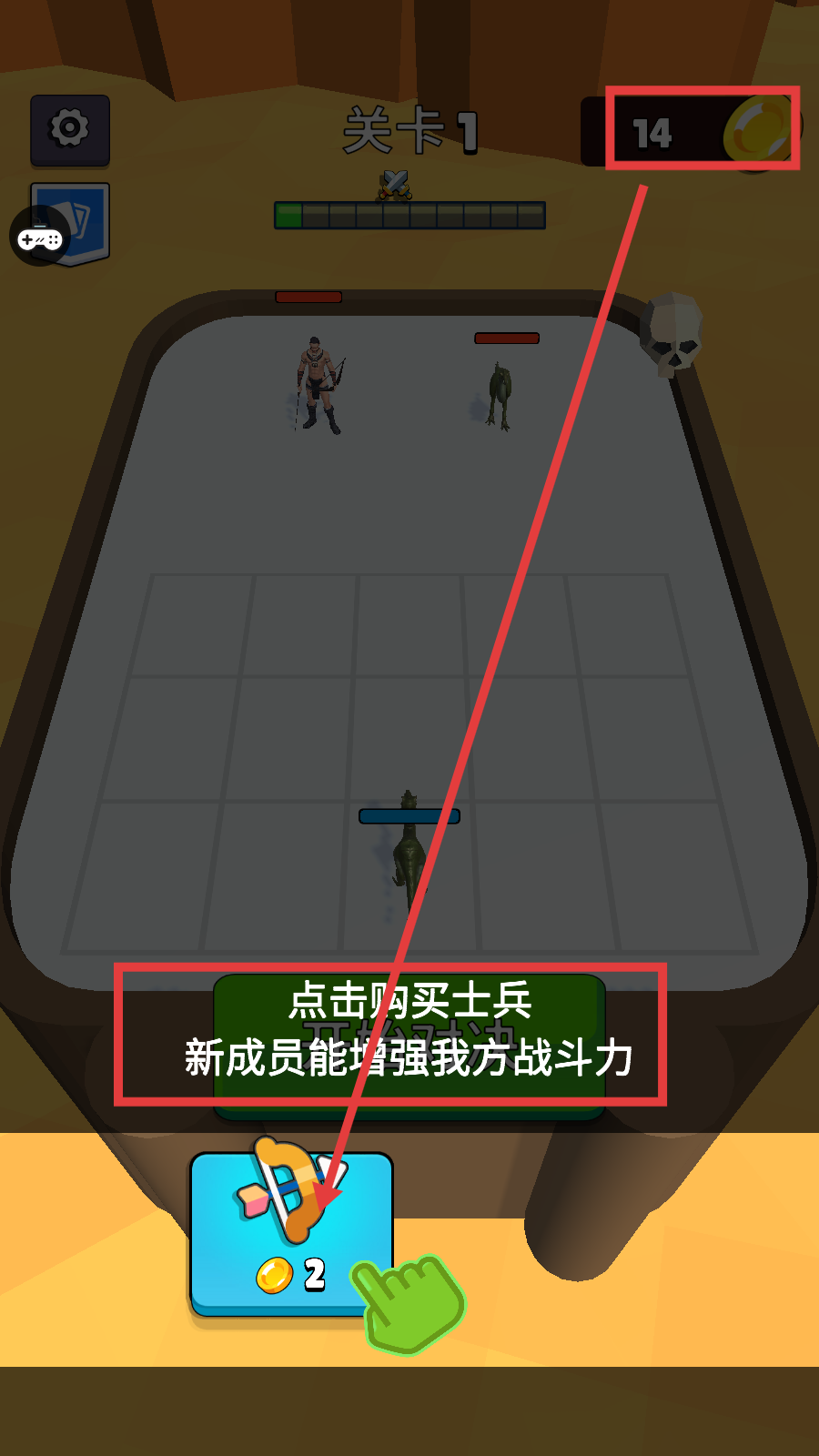1、在【关卡1】时,消耗【2】金币点击购买士兵,借助新成员提升我方战斗力,同时留意【右上角-14】的金币存量。