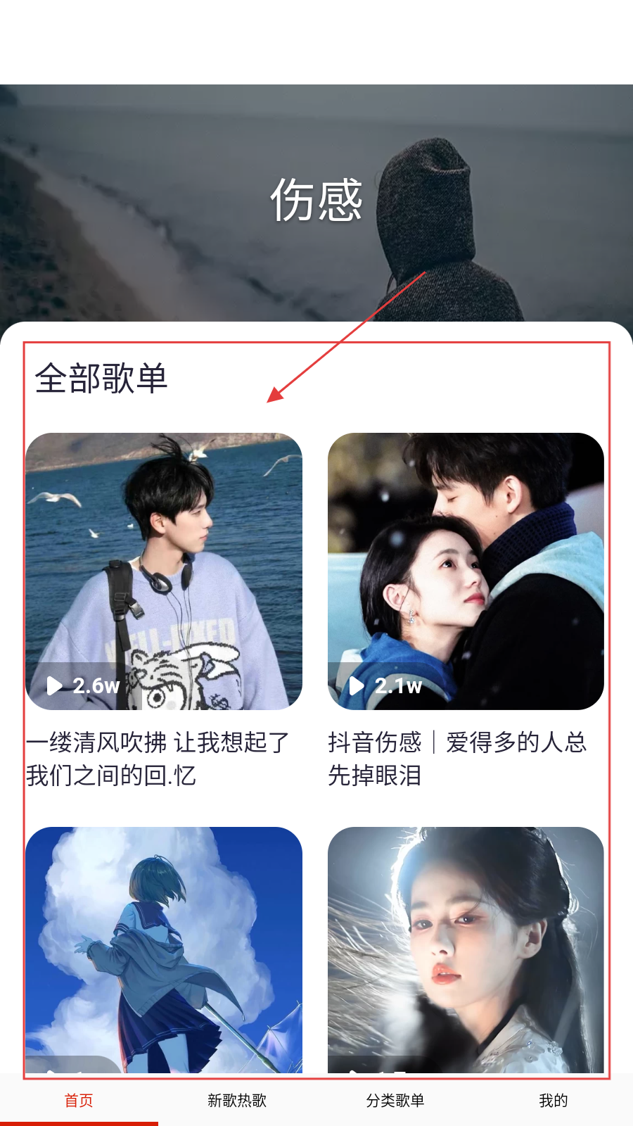 1、打开应用,在【首页】,选择想听的分类标签,如点击【伤感】。