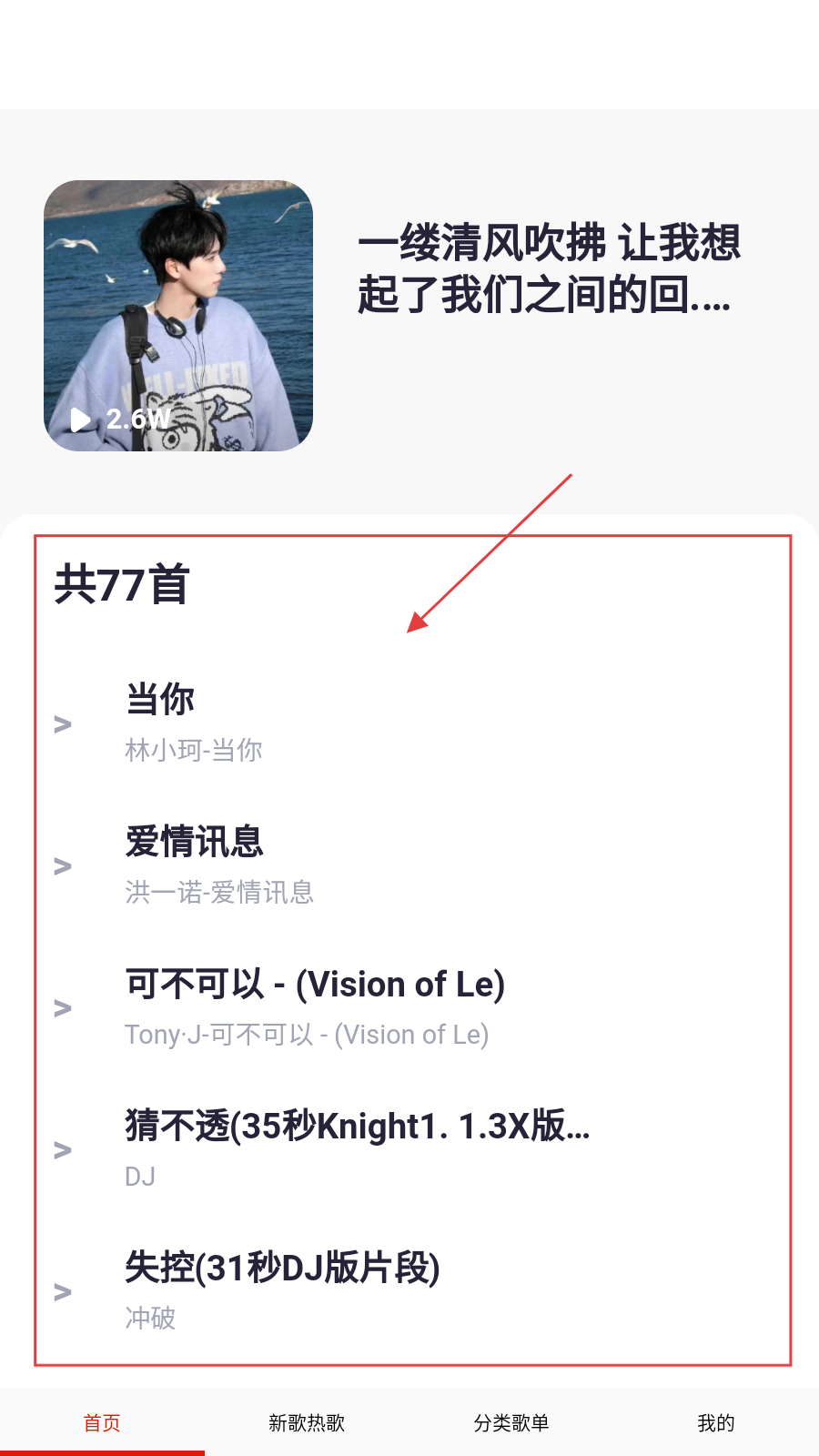 3、进入歌单详情页面,点击歌曲进行播放,如点击【当你】。