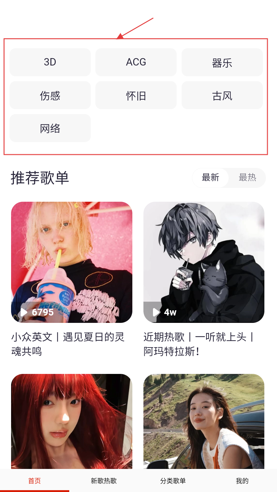 2、进入分类页面,查看歌单,选择感兴趣的歌单并点击进入。
