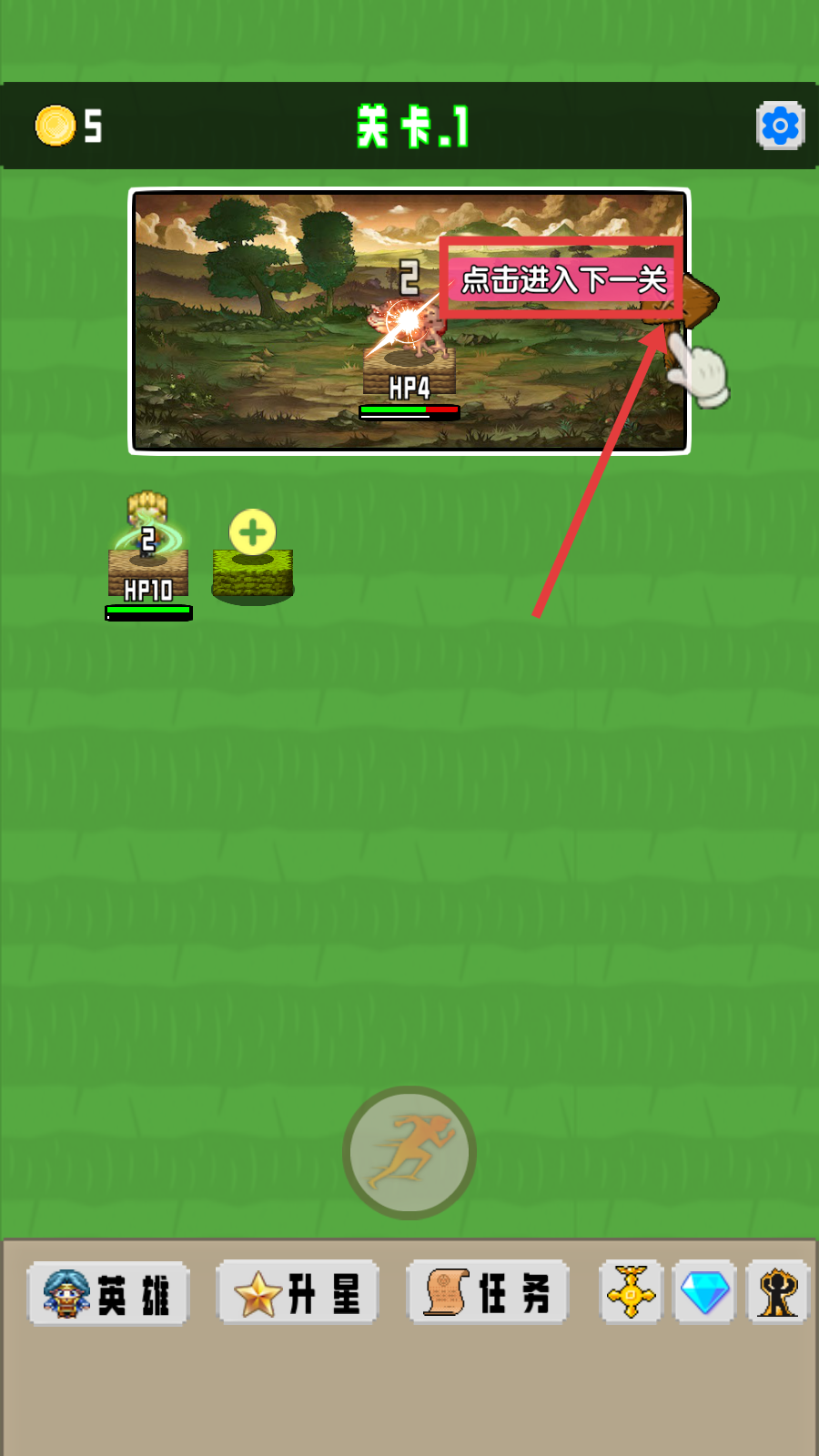 4、成功击败敌人后,点击【点击进入下一关】按钮,即可推进至【关卡.2】继续展开冒险。