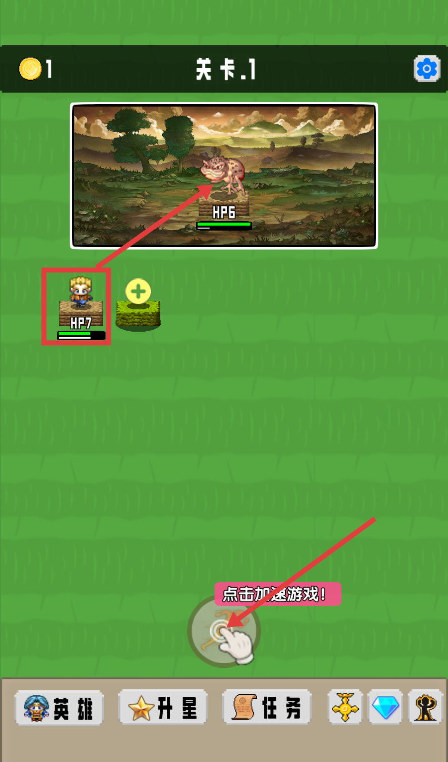 3、派出【拳师(HP7)】攻击敌人(HP6),点击下方【点击加速游戏】按钮,加快战斗节奏推进进程。