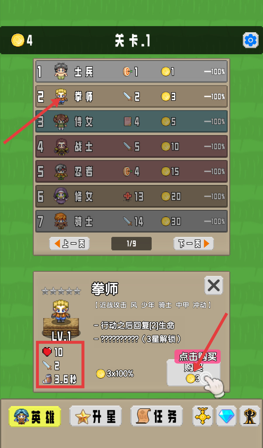 2、在英雄列表中选择【拳师】,消耗3金币购买该英雄(属性:生命10、攻击2、行动间隔3.6秒),增强队伍战力。
