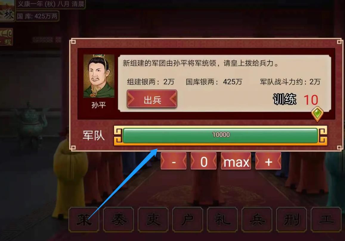 2·进入宣政殿后,点击兵部中的【组建军团】进入。