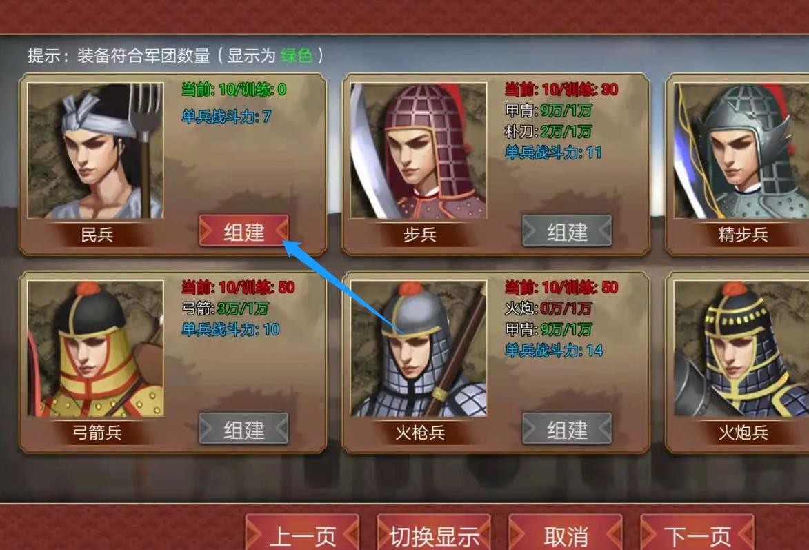 4·最后选择该军团的士兵的兵种,点击【组建】即可成功加兵。