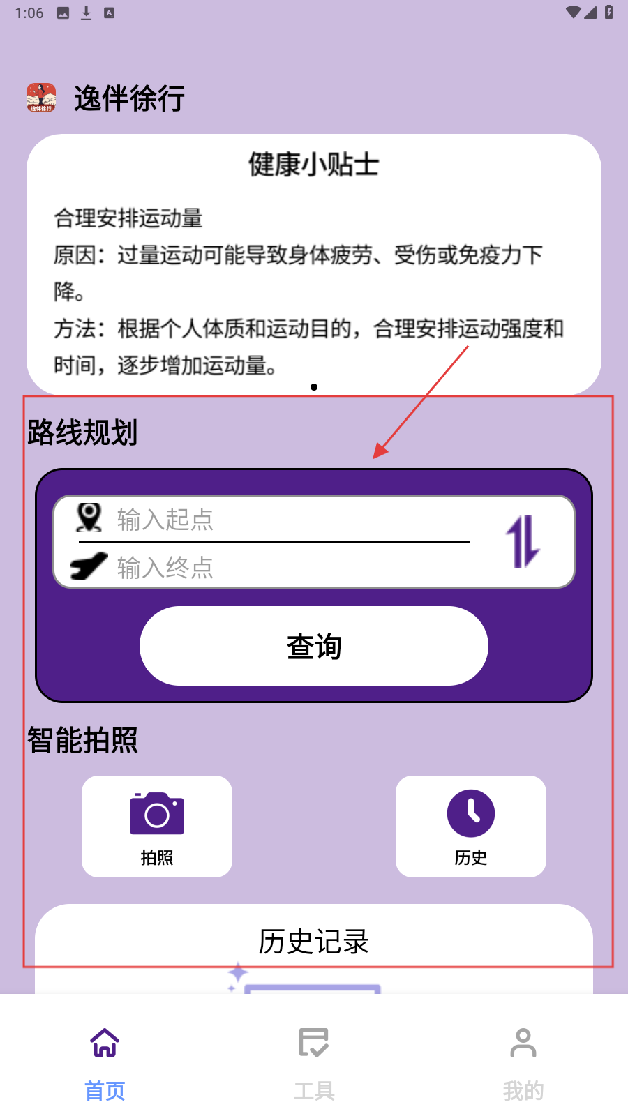 1、打开【逸伴徐行】,在路线规划填起点终点,点【查询】规划行程。