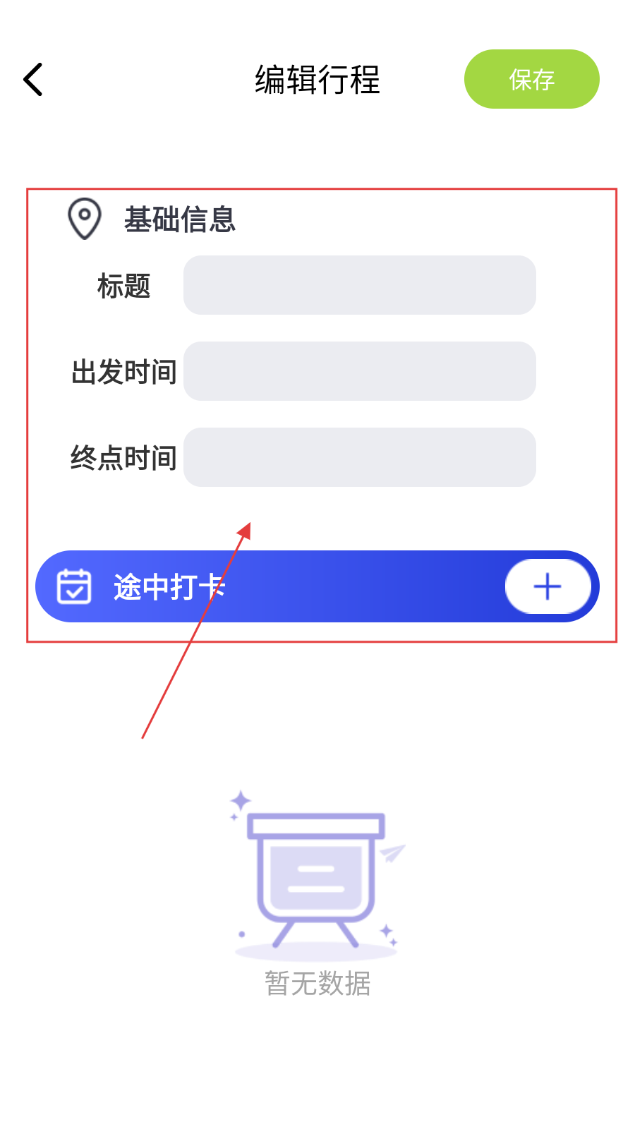 3、进入编辑行程,填标题、出发/终点时间,点【途中打卡 】添加地点。