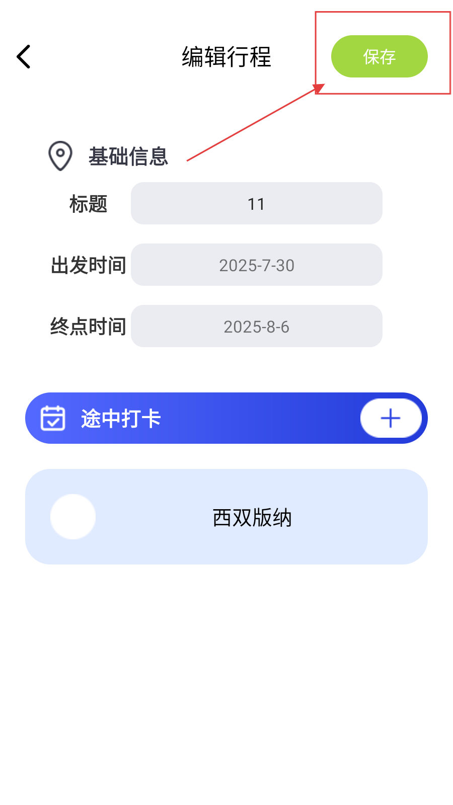 4、填完行程信息(如西双版纳),点右上角【保存】,完成计划创建。