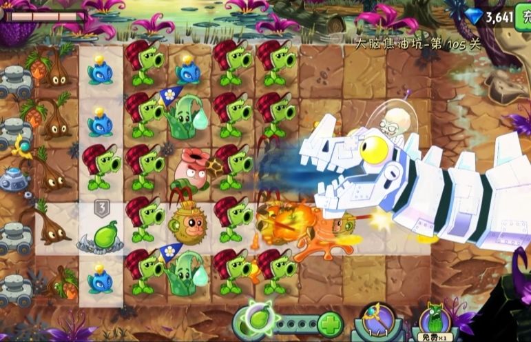 恐龙机械僵尸可靠眼睛发射一道激光,扫过整行杀死植物与僵尸的同时把该行化作无法种植植物的焦土。