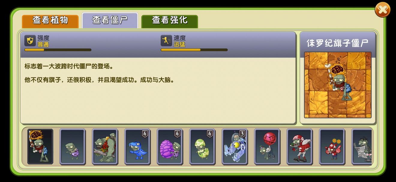 9.甲龙,在入场后,当有僵尸进入第九格时,甲龙将会挥动尾巴,将僵尸击至本行存在植物的最右列的同时将该植物击退一格。与该植物相邻的本行植物同样响应击退效果。当本行无植物时,甲龙可以把僵尸击至最远第二列的位置。挥动尾巴的动作进行5次后,或甲龙在场中停30秒后,它将离开。
