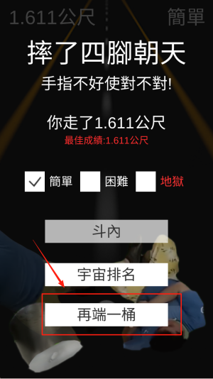 3、查看成绩:跌倒后画面显示“你走了1.611公尺”,记下最佳成绩,点击“再端一桶”重新挑战。