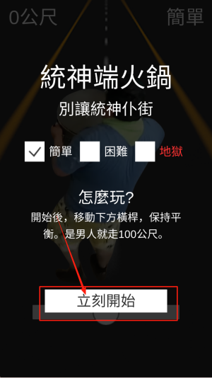 1、了解玩法:阅读“怎磨玩?”提示,记住“移动下方横杆保持平衡,是男人就走100公尺”,然后点击“立刻開始”。