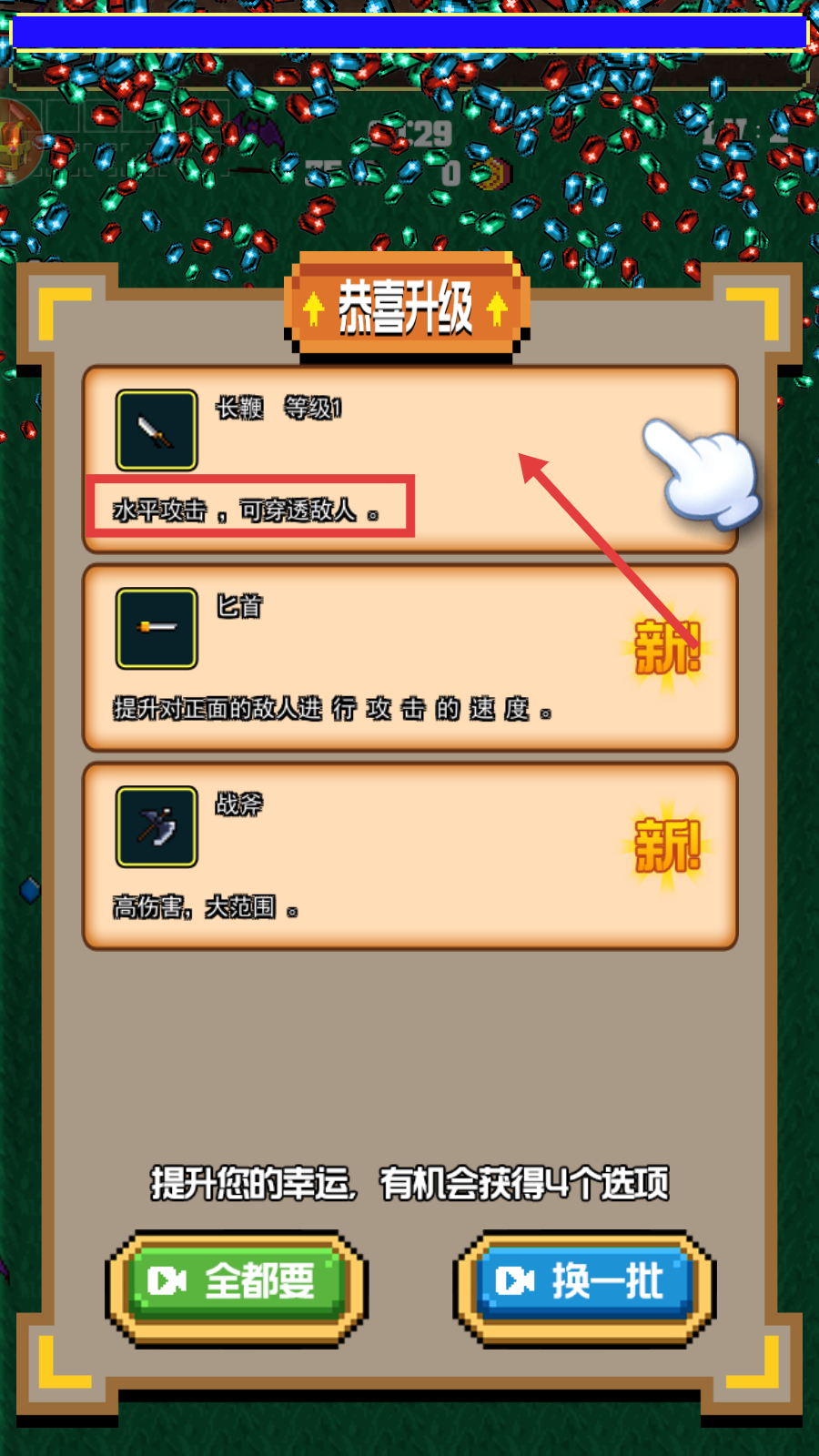 3、升级时选【长鞭-等级1】,利用【水平攻击-可穿透敌人】特性,高效应对群敌提升清场能力。