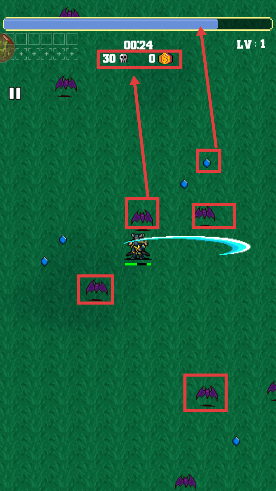 2、战斗中击杀【蝙蝠】敌人,收集蓝色水晶,关注【30-击杀数】和进度条,推进关卡进程。