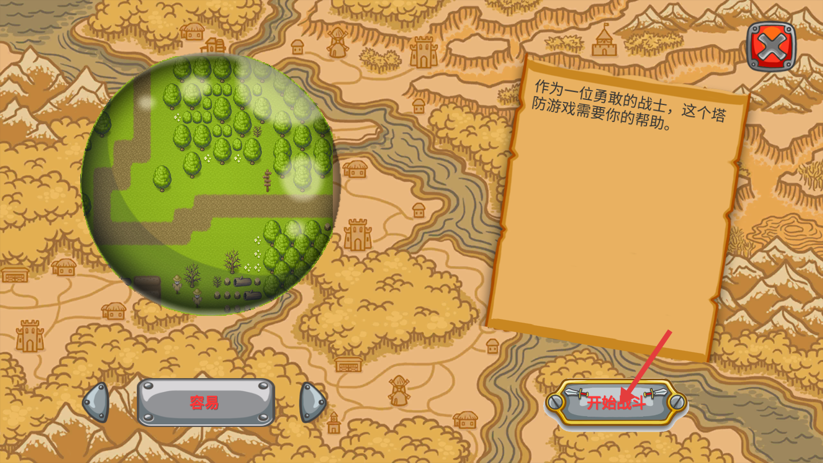 1、点击【开始战斗】进入塔防游戏,选择【容易】难度起步,跟随剧情指引开启冒险之旅。