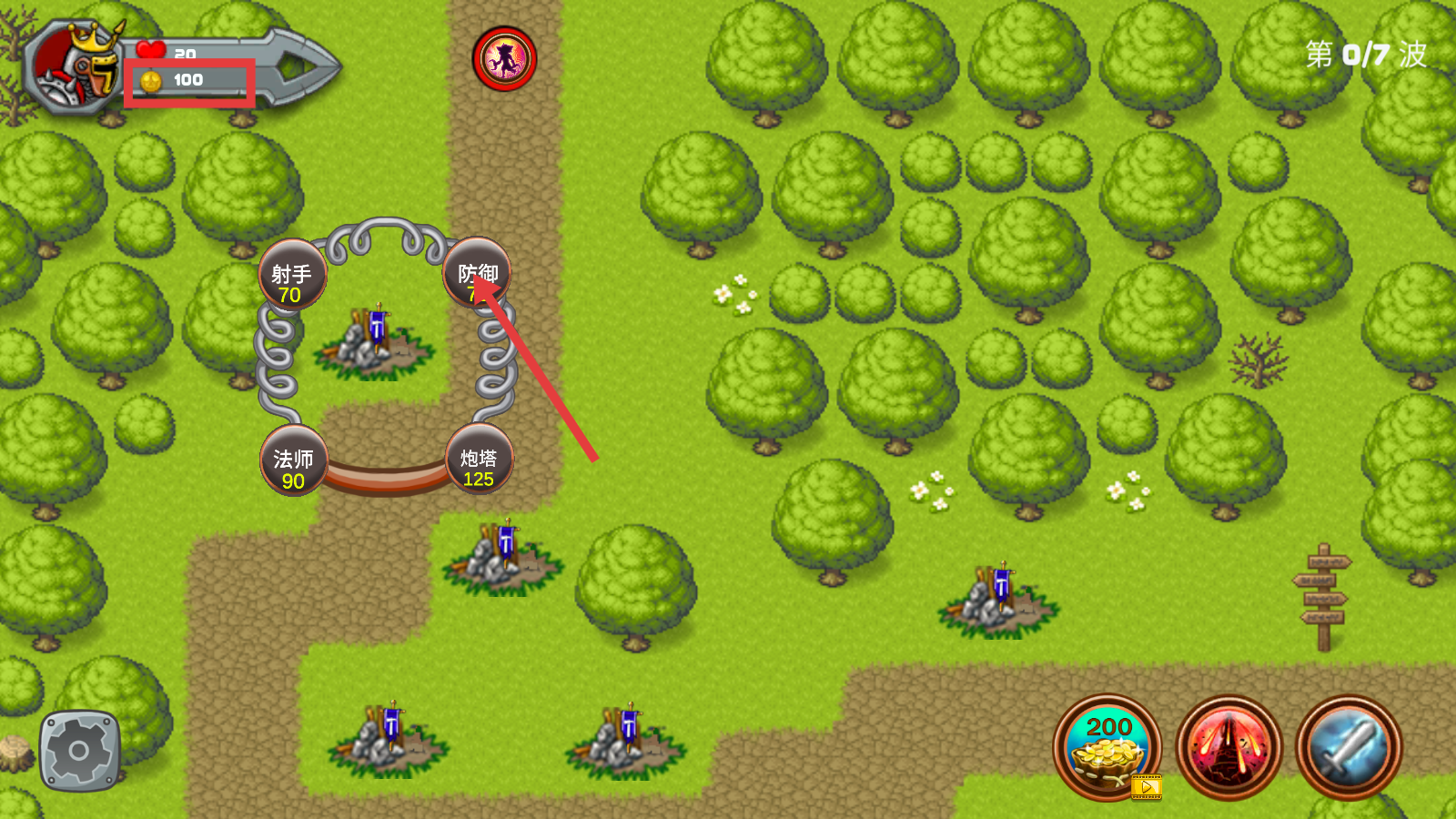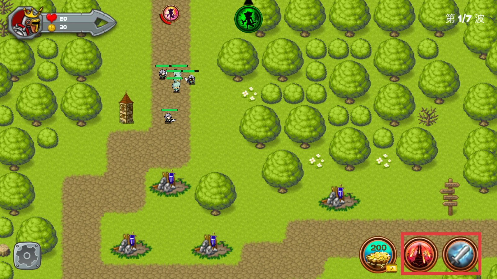 3、第【1/7】波战斗时,合理使用右下角技能按钮,配合防御塔高效消灭敌人积累【200】金币。