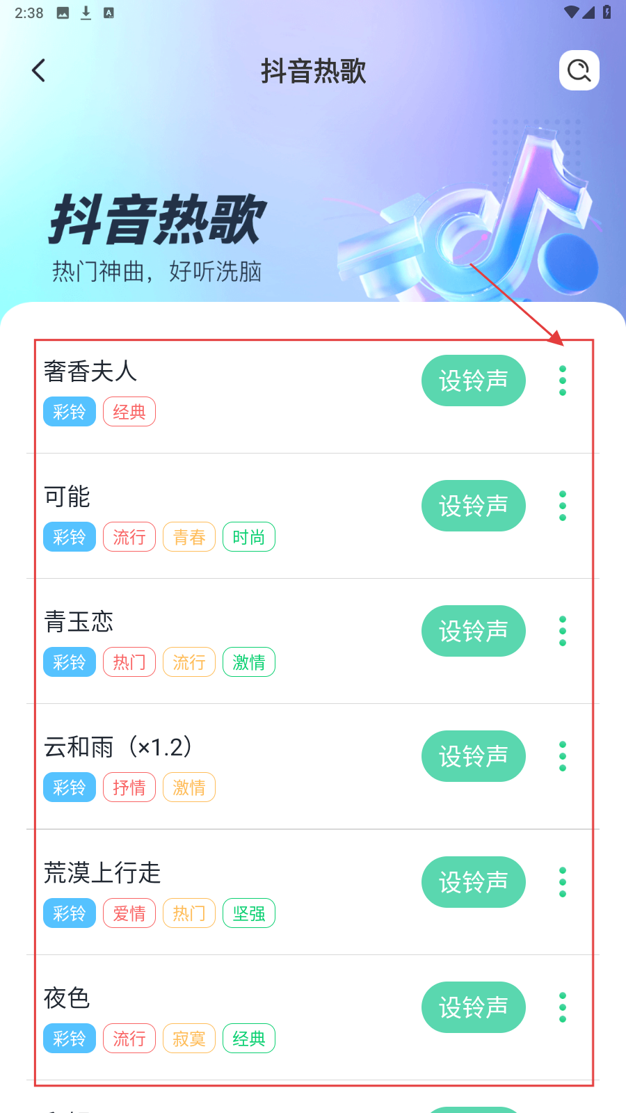 2、在抖音热歌列表,选喜欢的铃声,点右侧更多按钮。