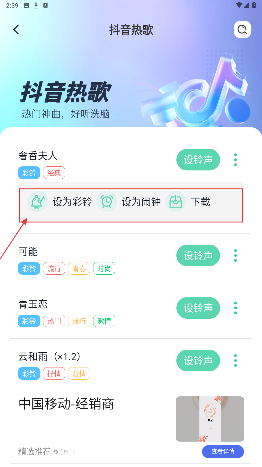 3、展开操作栏,选【设为彩铃】等功能,设置铃声用途。