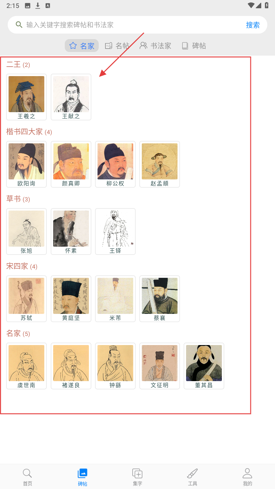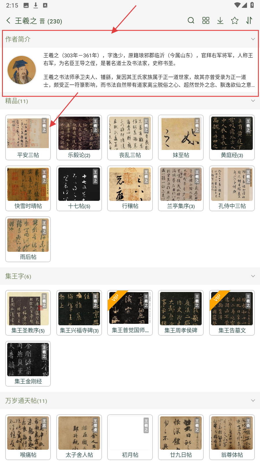 1、进入碑帖页,选【王羲之】等名家,查看作者简介与作品列表。