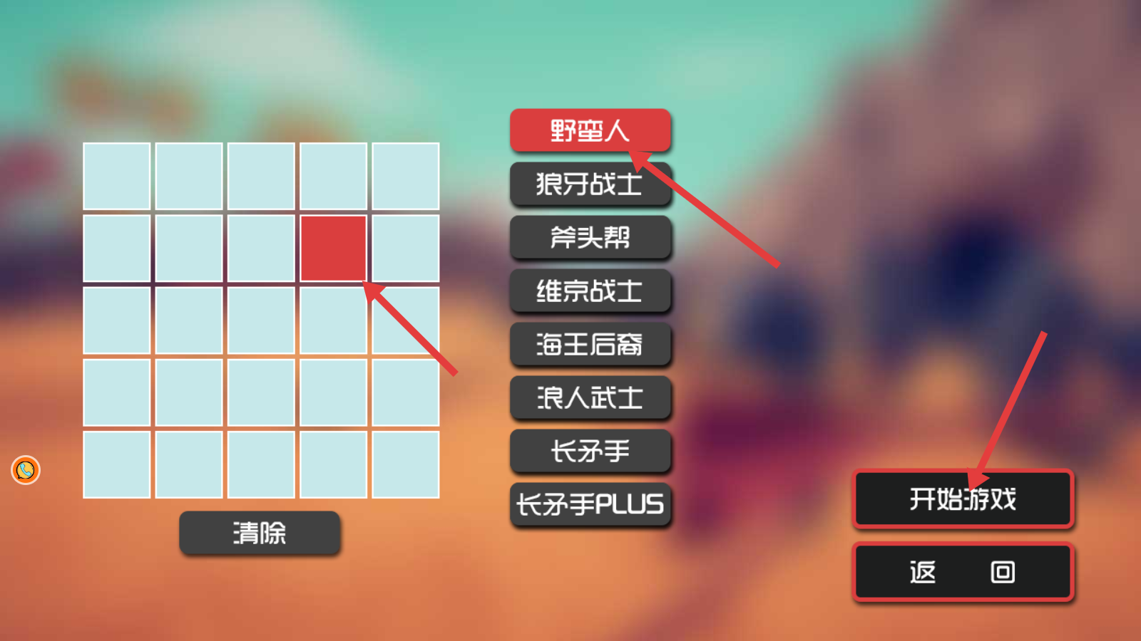 2、选择【野蛮人】兵种,部署到红色格子,点击【开始游戏】,进入实战检验兵种战力。