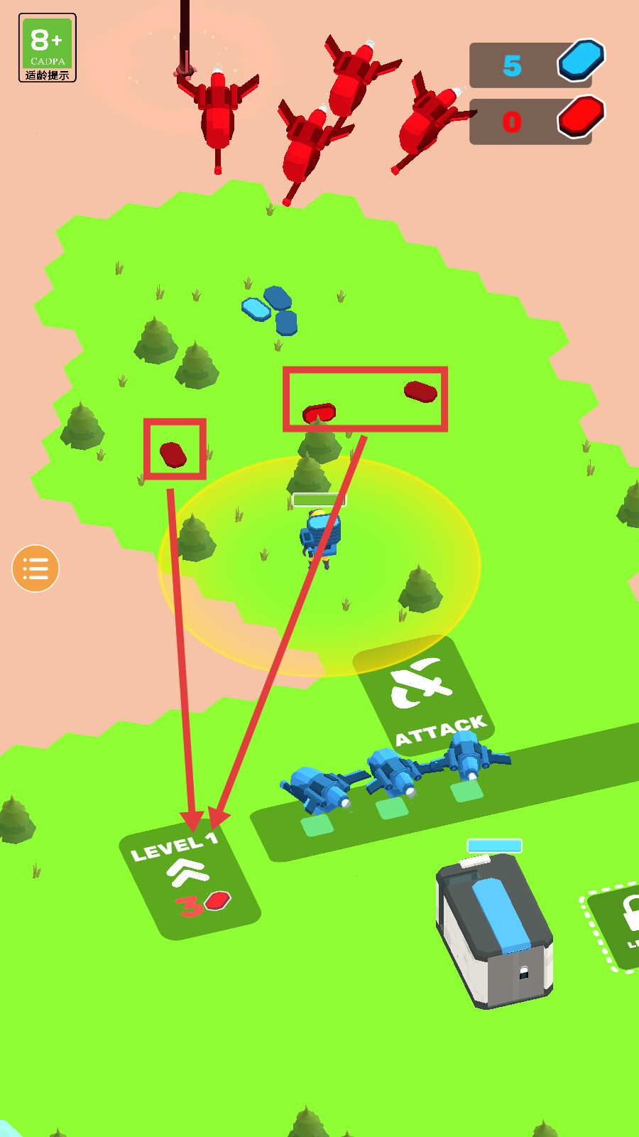 3、收集【红色资源】满足LEVEL1升级条件,通过箭头区域获取资源提升炮台战力,推进关卡进程。