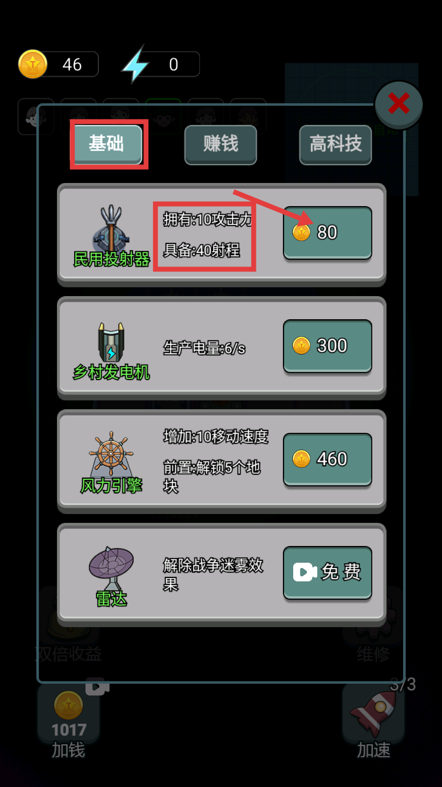 3、消耗80金币升级【民用投射器】,获得10攻击力与40射程,增强船只攻防能力助力发展。