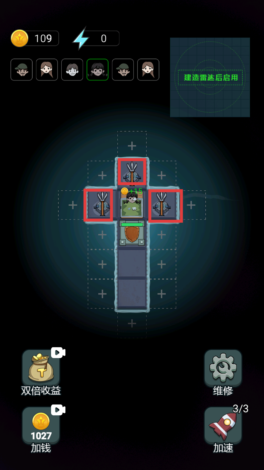 4、将【民用投射器】呈十字布局摆放,高效获取资源,配合功能按钮提升金币收益加速发展。