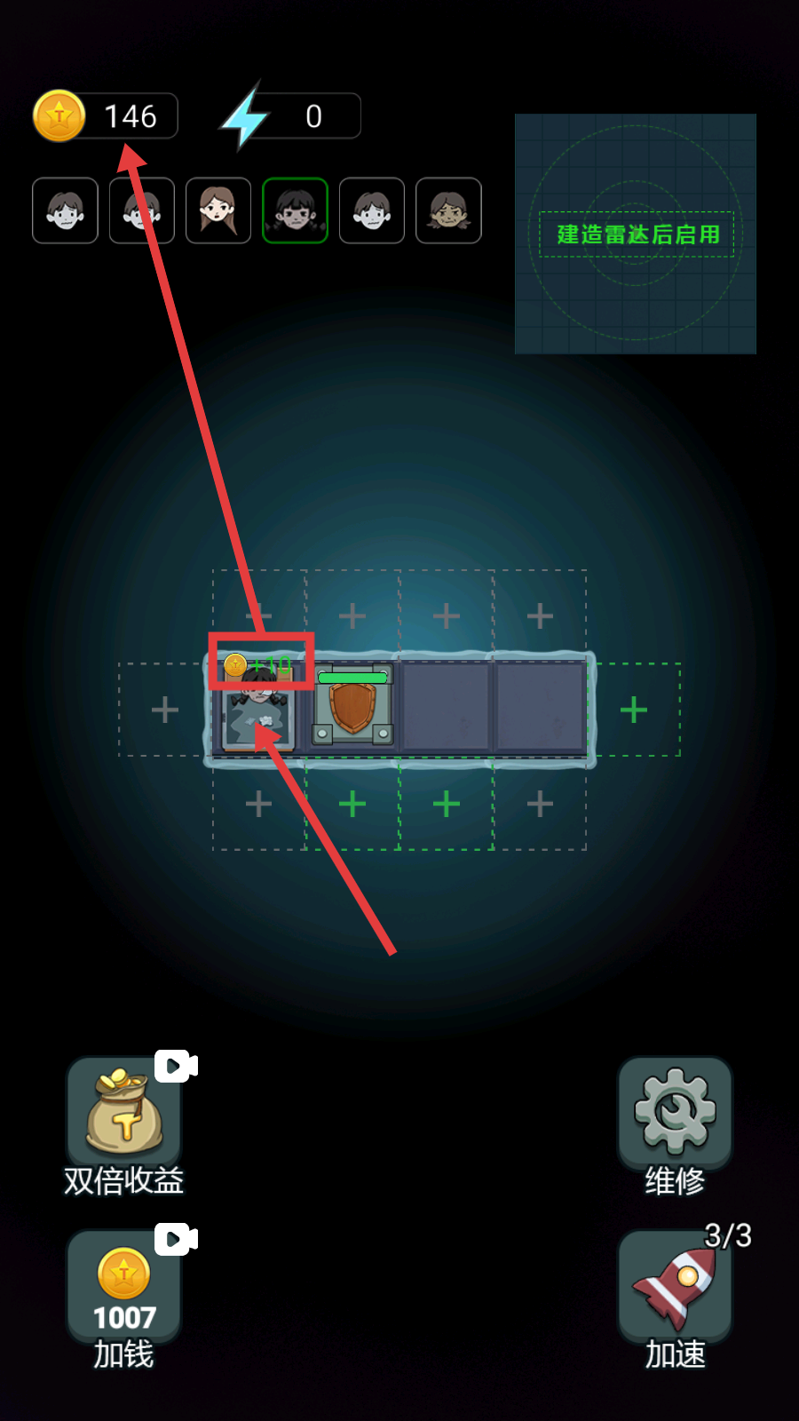 2、通过船只收集资源积累金币,留意【建造雷达后启用】的区域,为解锁新探索区域做准备。