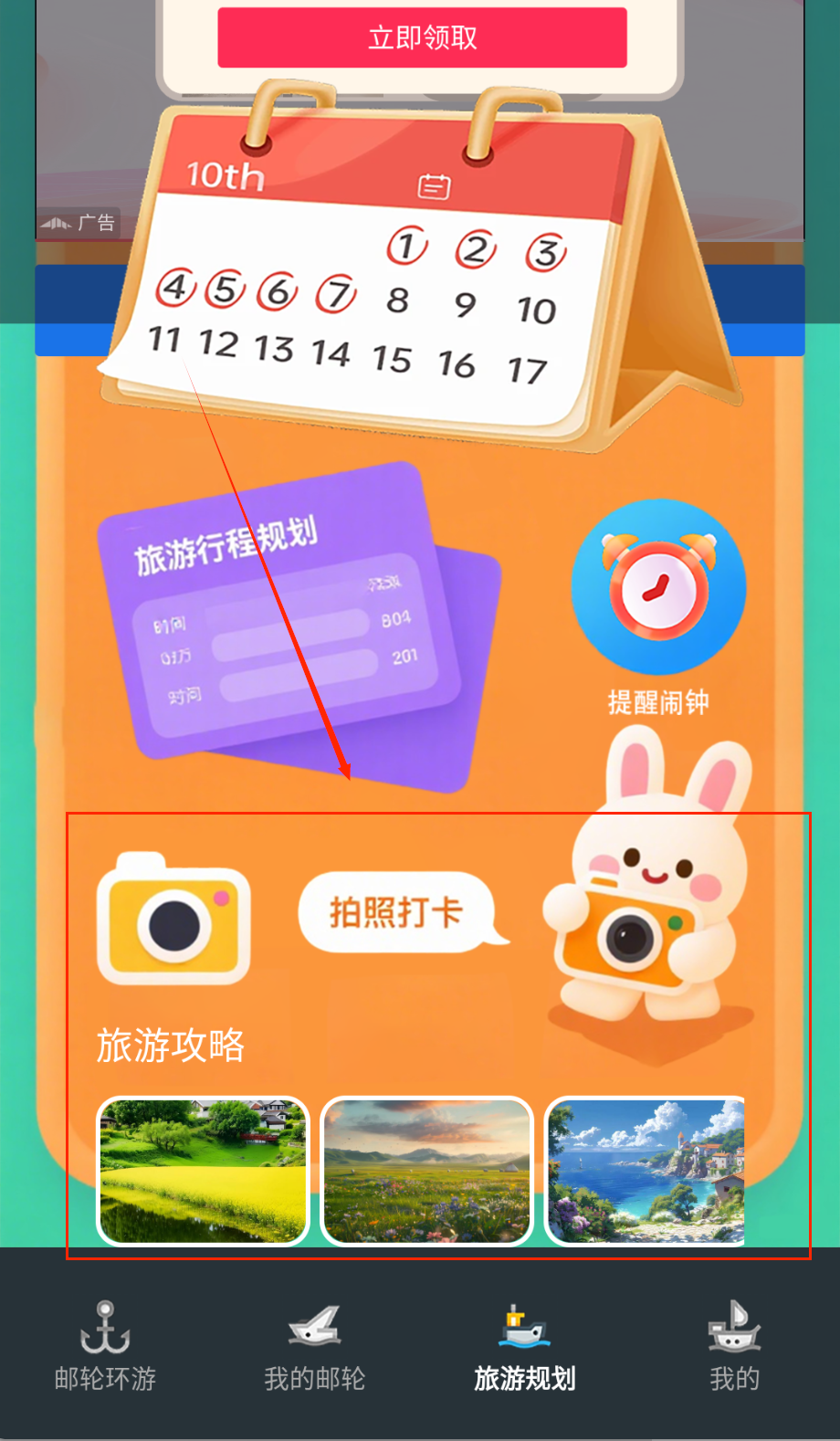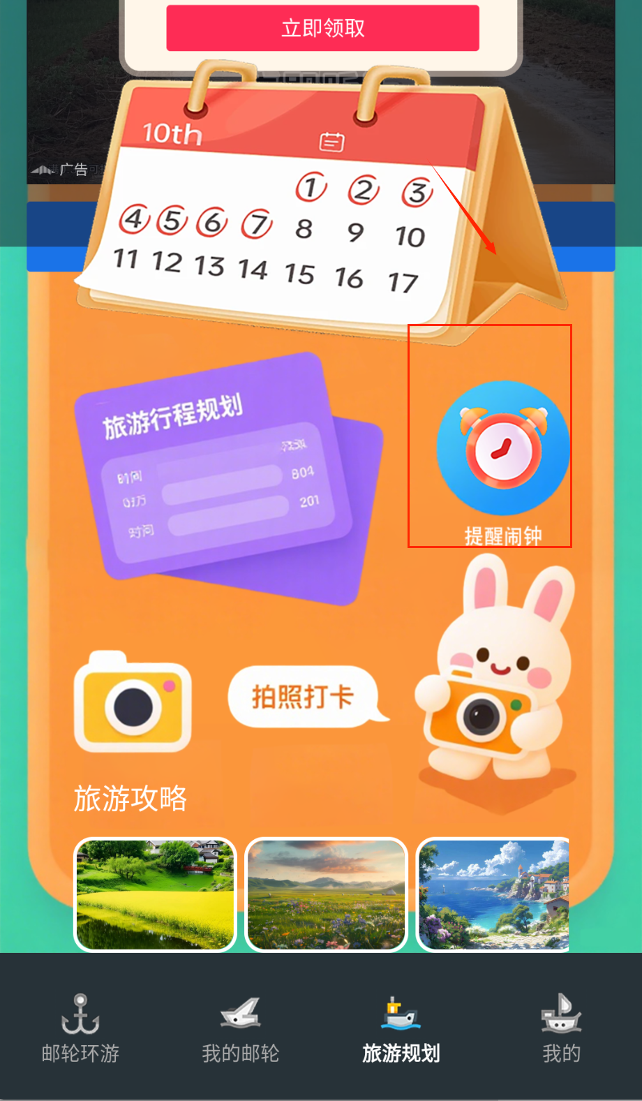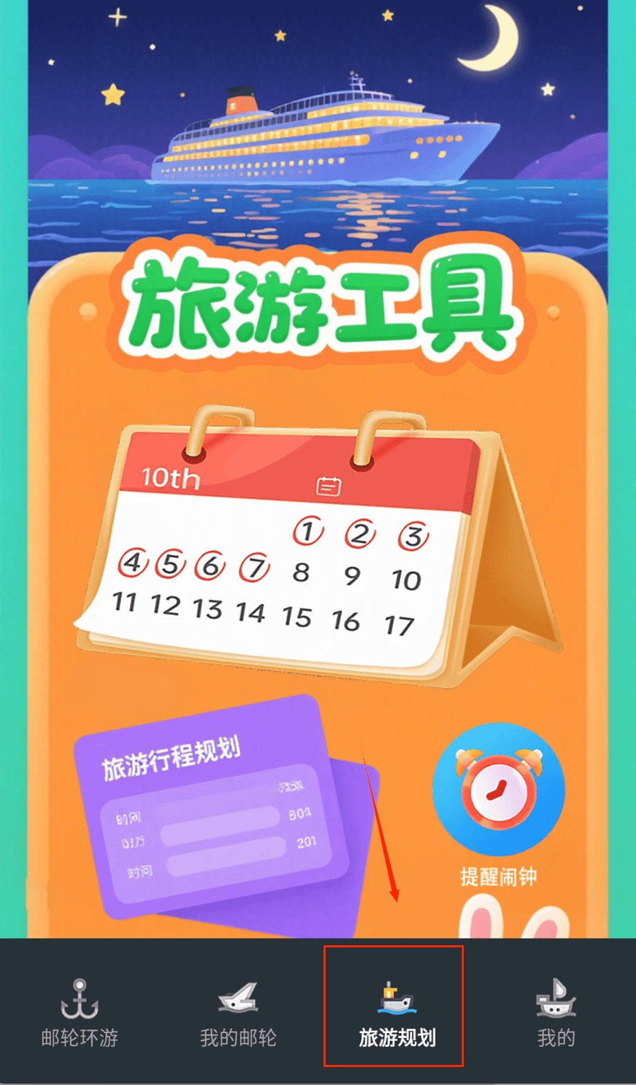 4、 出发前在工具中心设置行程提醒闹钟,开启自动打卡功能记录每个停靠港的到访时间,航行期间可随时查看定位地图掌握邮轮实时位置。