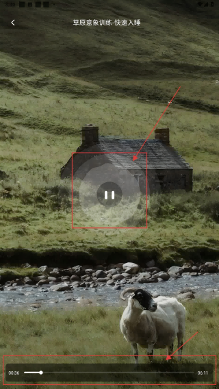 4、进入训练播放页,可暂停、拖动进度条,跟随【草原意象训练】音频助眠。