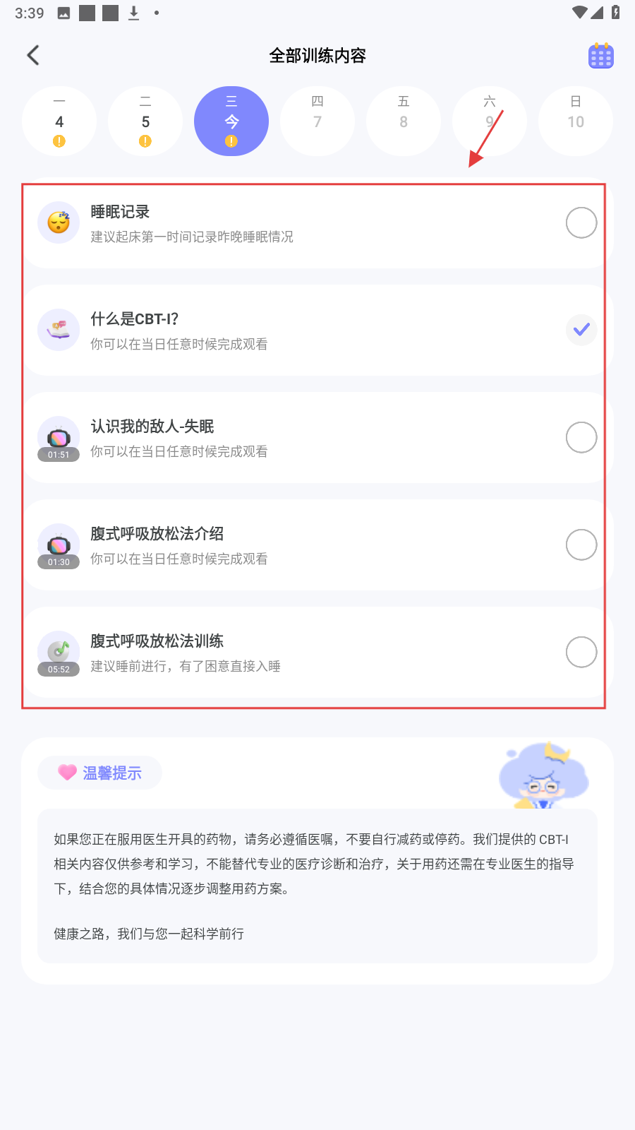 2、在【全部训练内容】里,按序完成【睡眠记录】【什么是CBT-I?】等任务。
