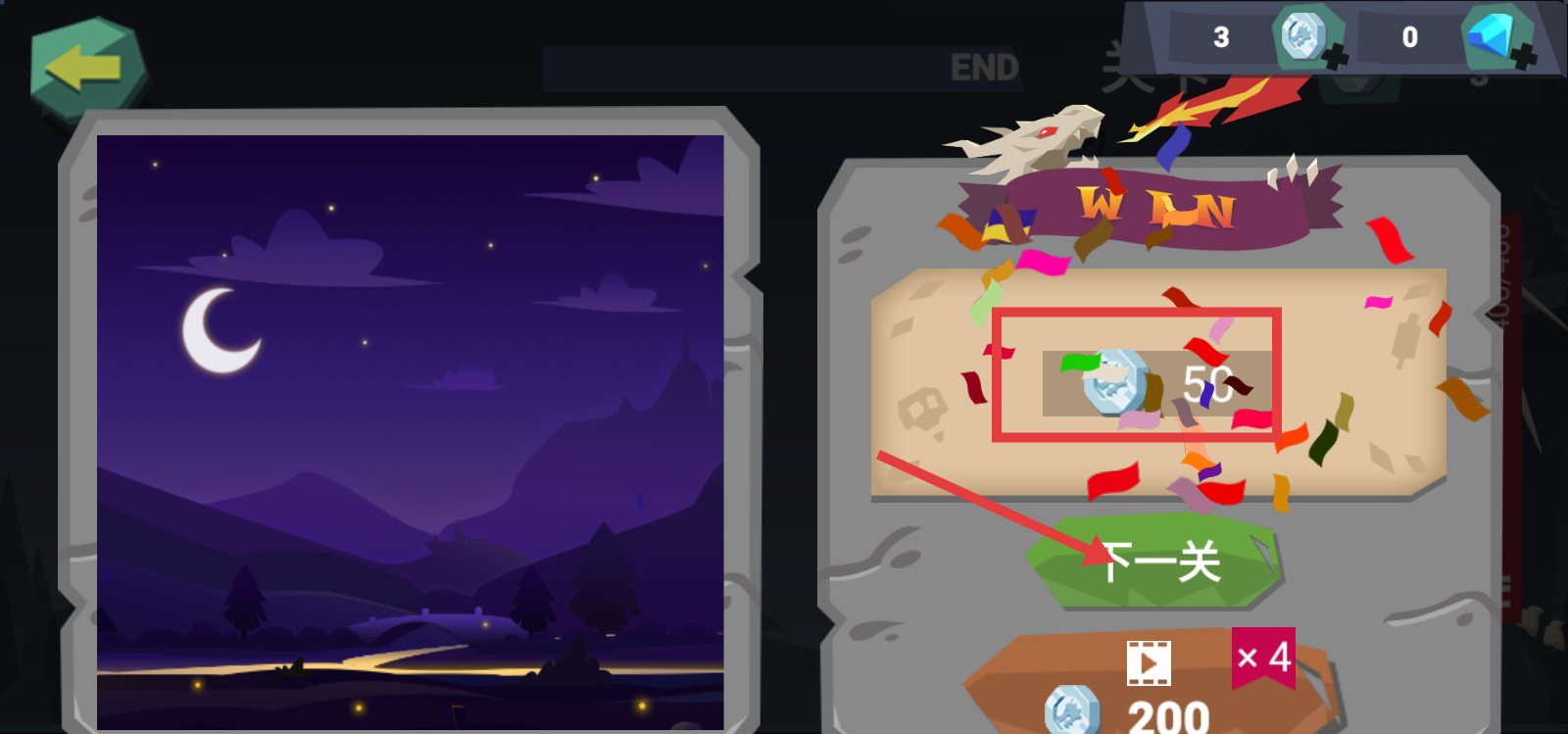 4、胜利后获得【50】奖励,点击【下一关】按钮,延续冒险挑战后续关卡,积累更多奖励。