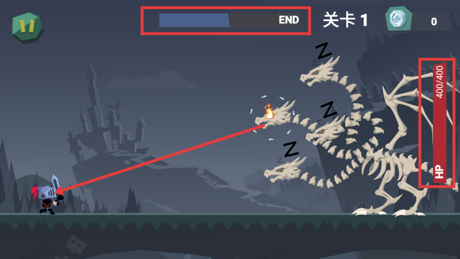 3、关注顶部【END】进度条与右侧【HP-400/400】,操纵龙首消灭所有的骑士,推进关卡的进程。