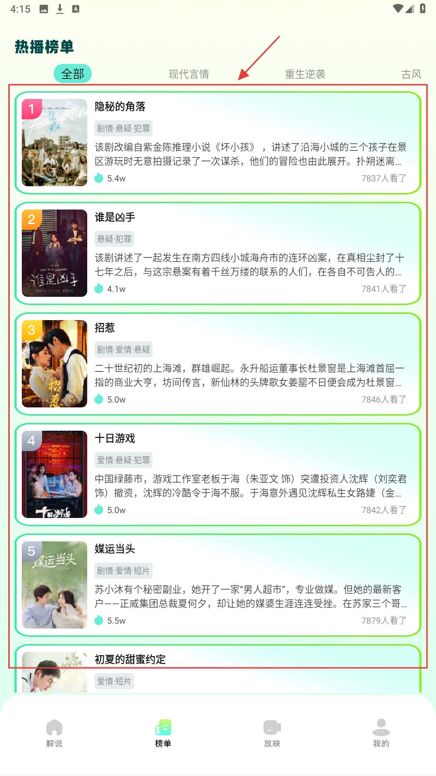4、切换到【榜单】页,从【热播榜单】选《隐秘的角落》等热门短剧观看。