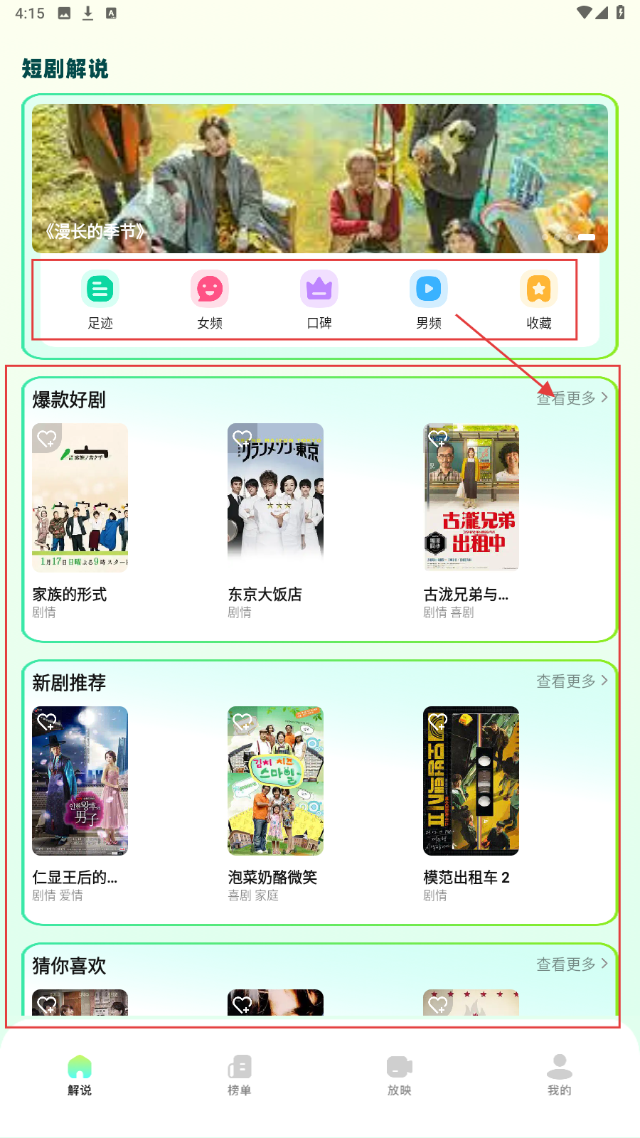 1、进入【解说】页,通过【足迹】【女频】等标签筛选短剧。