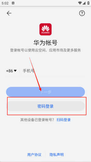 1、登录华为帐号:在“手机号”栏输入号码并获取验证码,点击“密码登录”完成帐号登录。