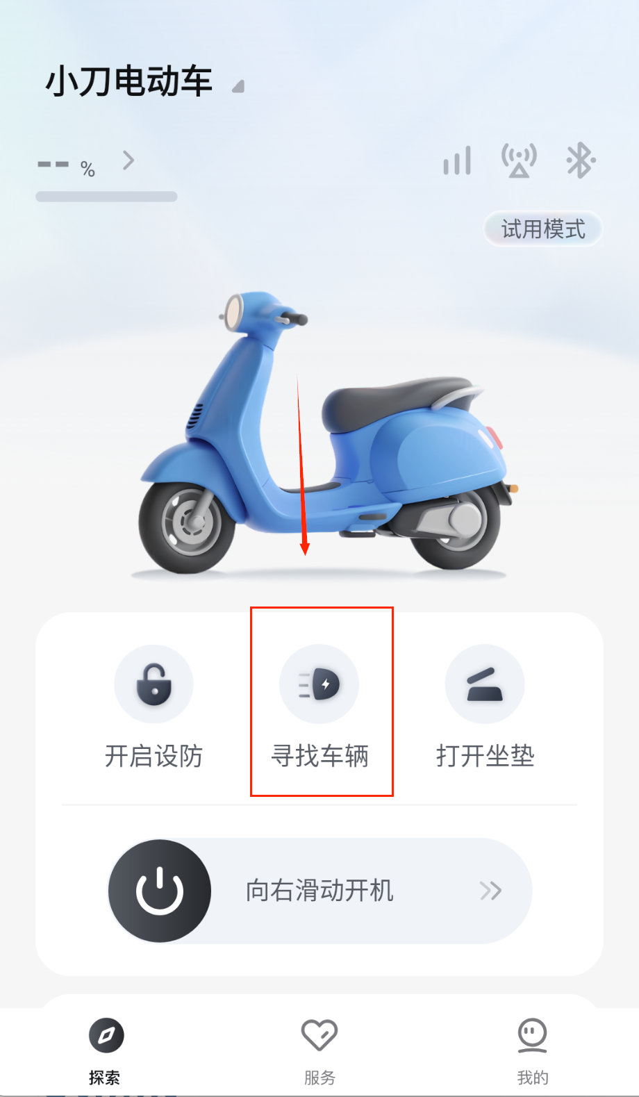 1、 手机开启蓝牙后进入应用,扫描附近小刀电动车完成绑定,首次连接需长按车辆电源键5秒激活配对模式。