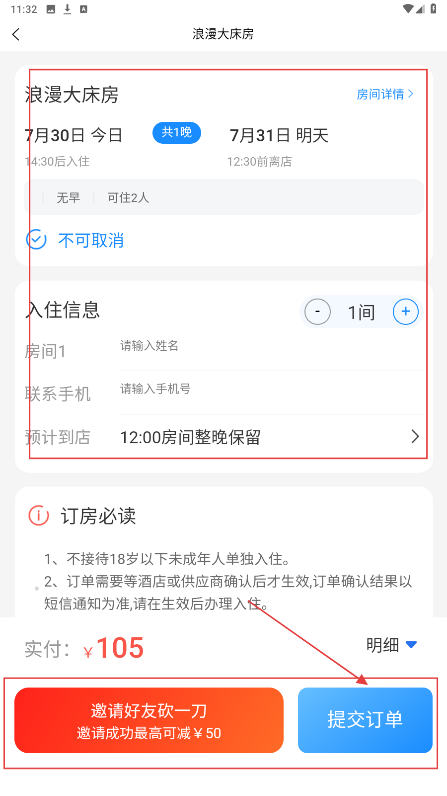 4、填姓名、手机号等,核对规则后点【提交订单】完成预订。