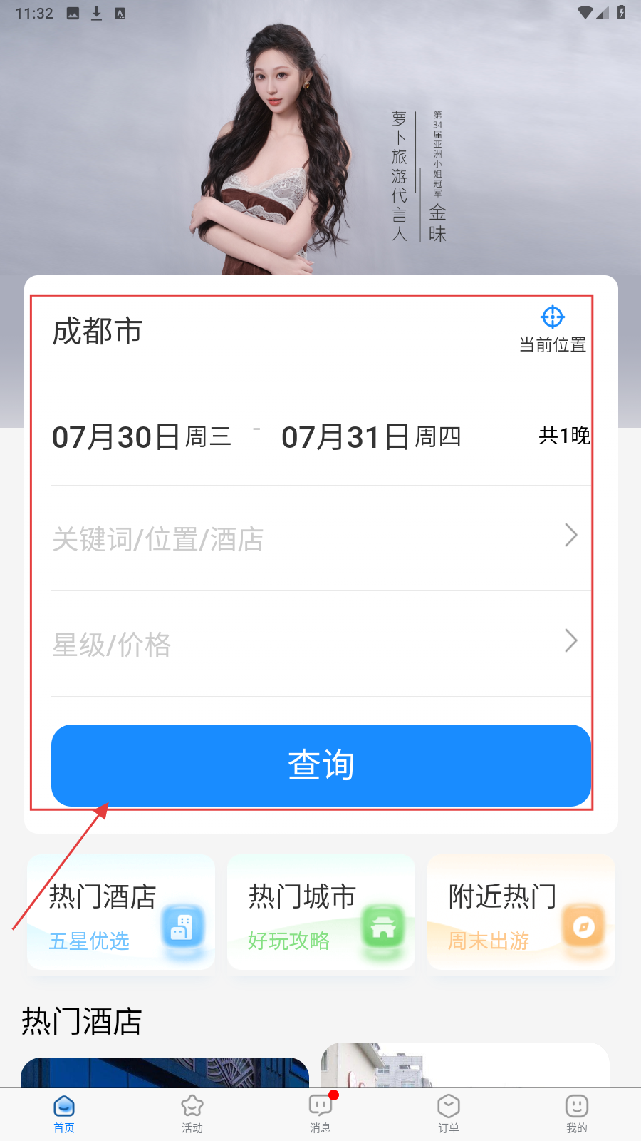 1、选定城市【成都市】、日期【07月30日-07月31日】,填条件点【查询】找酒店。