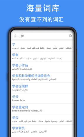 2、阿汉词典庞大的阿拉伯语词汇量,100万级,涵盖所有领域的内容,详细的阿拉伯语和汉语讲解和例句,充分了解单词的用法。