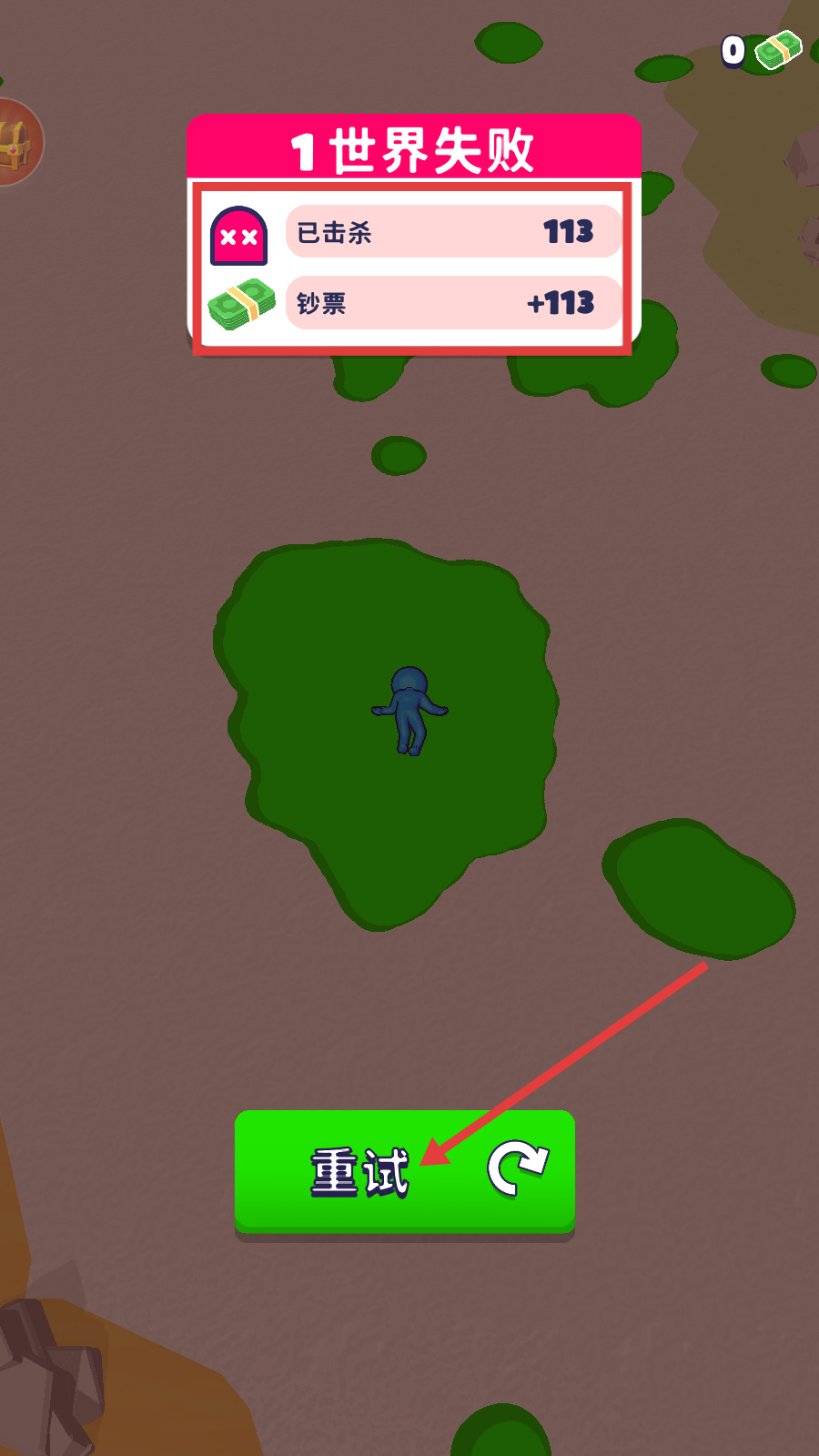 4、若【1世界失败】,查看【已击杀-113】与【钞票- 113】奖励,点击【重试】按钮再战提升表现。