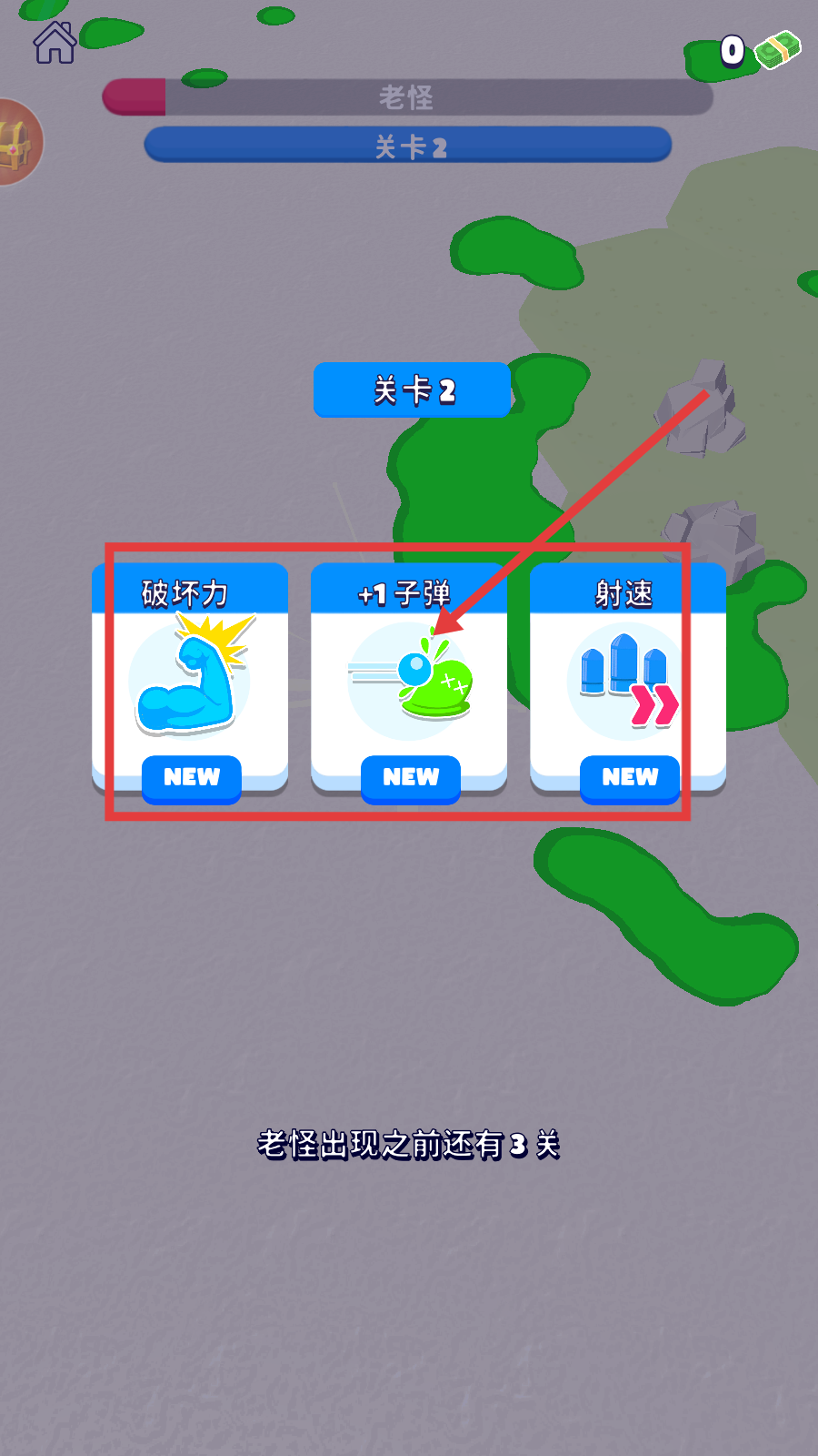 3、抵达【关卡2】后,可选【破坏力】【 1子弹】【射速】增益强化角色,助力后续战斗闯关。
