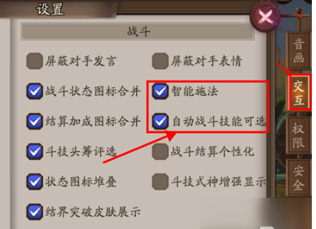 3、在战斗相关的设置项中,确保已勾选“智能施法”和“自动战斗技能可选”这两个选项。