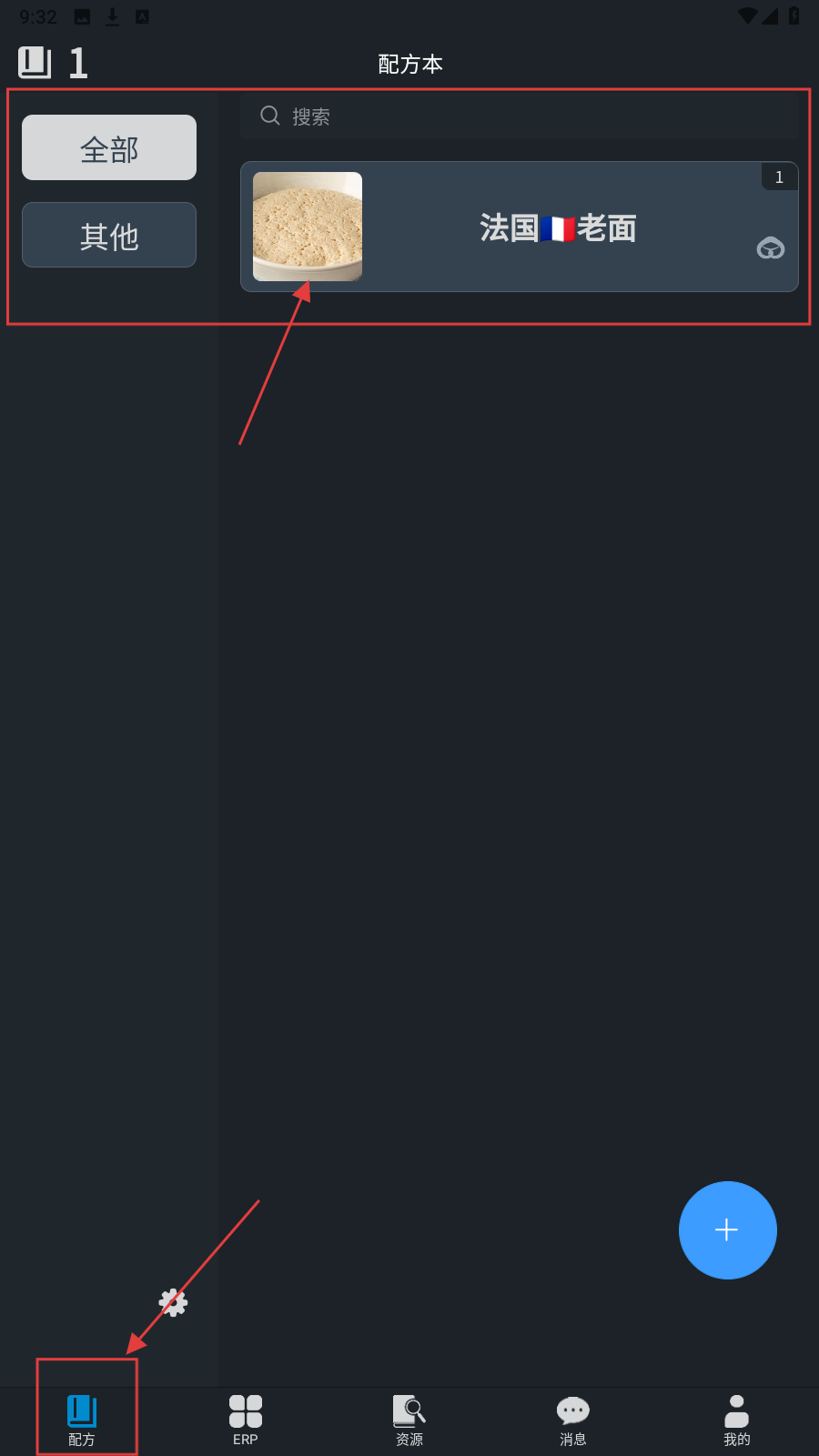 1、打开应用,在【资源】页面,可以选择需要查看的配方,如点击【法国老面】。