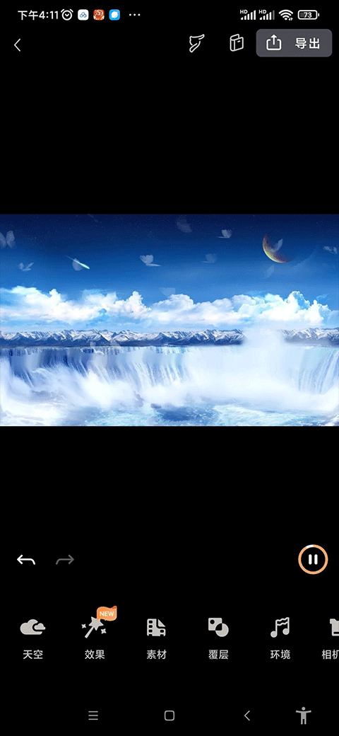 6、然后点击“覆层”,选择图中所示的“ES09”效果,就是加飞舞的蝴蝶,当然也可以加别的特效,好了点击右上角“导出”按钮。