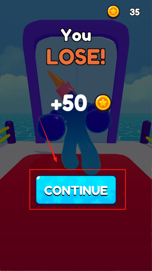 4、接受结果:若看到“35 You LOSE! 50 CONTINUE”,点击继续按钮领取安慰积分并重试。