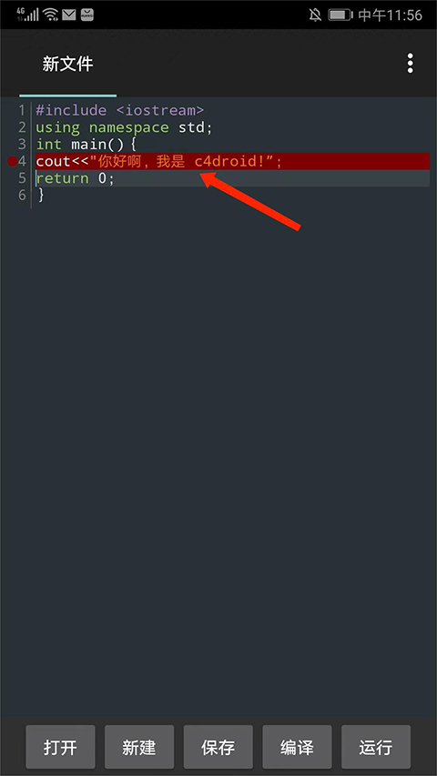 2、然后打开c4droid,进行测试代码,将代码输入或者复制到输入框中,