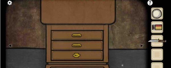 1、进入游戏后,在场景中可以看到一个三层的矮柜子,从柜子上方拿到表面皿,从抽屉里拿到火柴和刀。