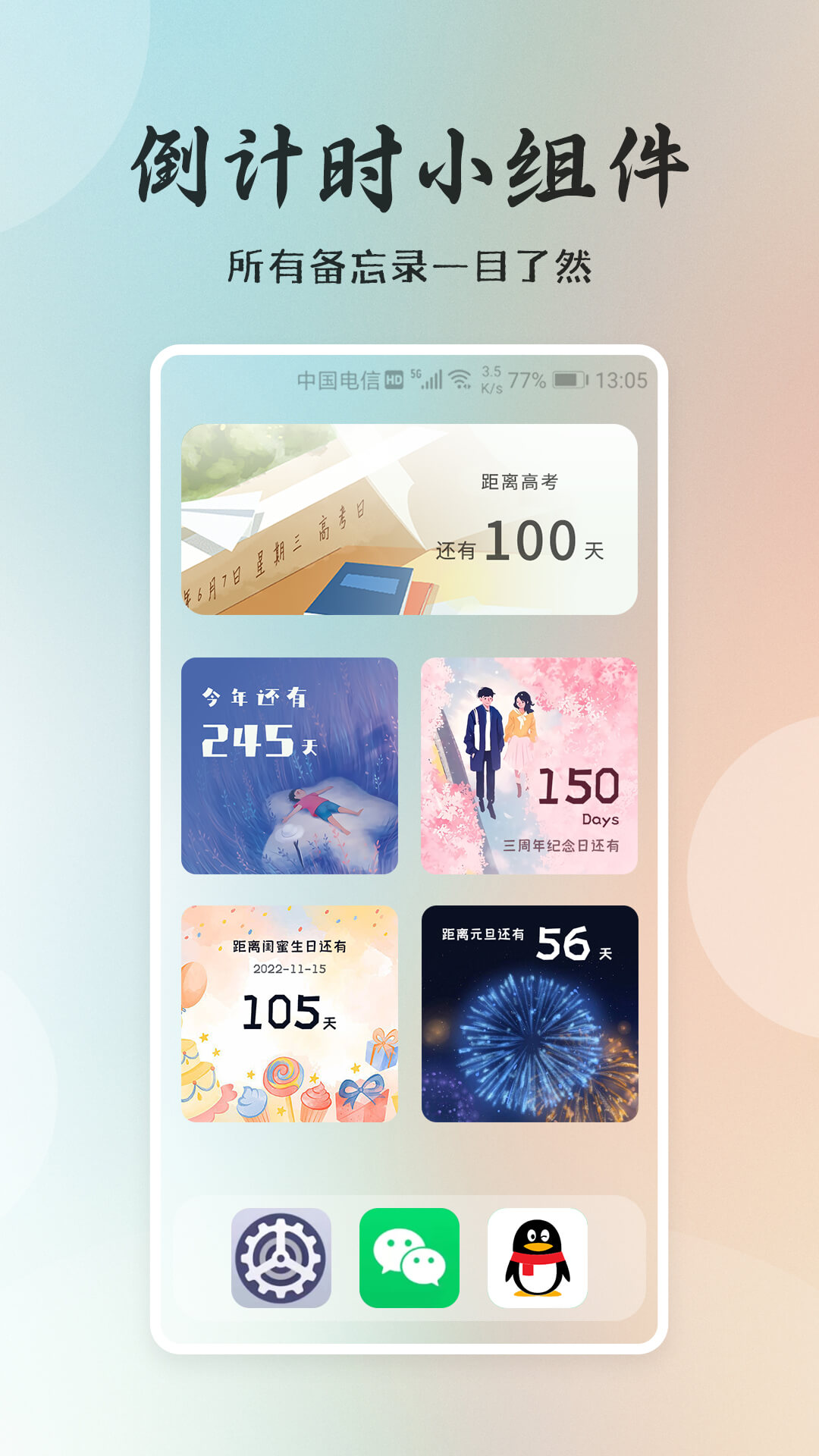 2、本小程序软件功能非常丰富,包括时钟、倒计时、正日、文字等。